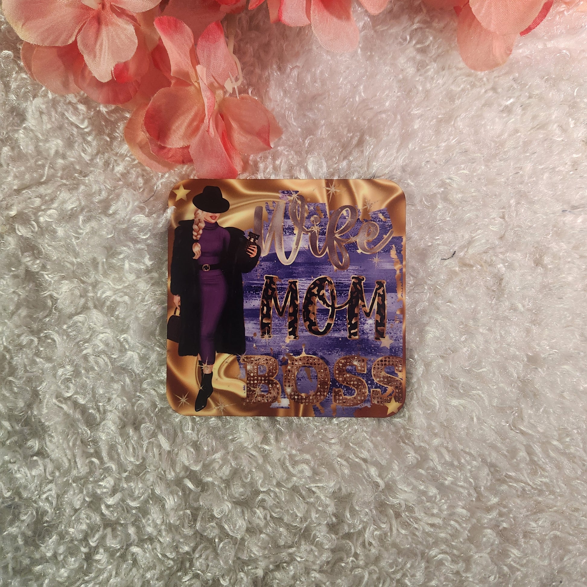 Enhance your home decor with our Wife Mom Boss coasters. These stylish and durable coasters feature a unique design and are perfect for protecting your surfaces from spills and stains. Elevate your hosting game with these must-have coasters.