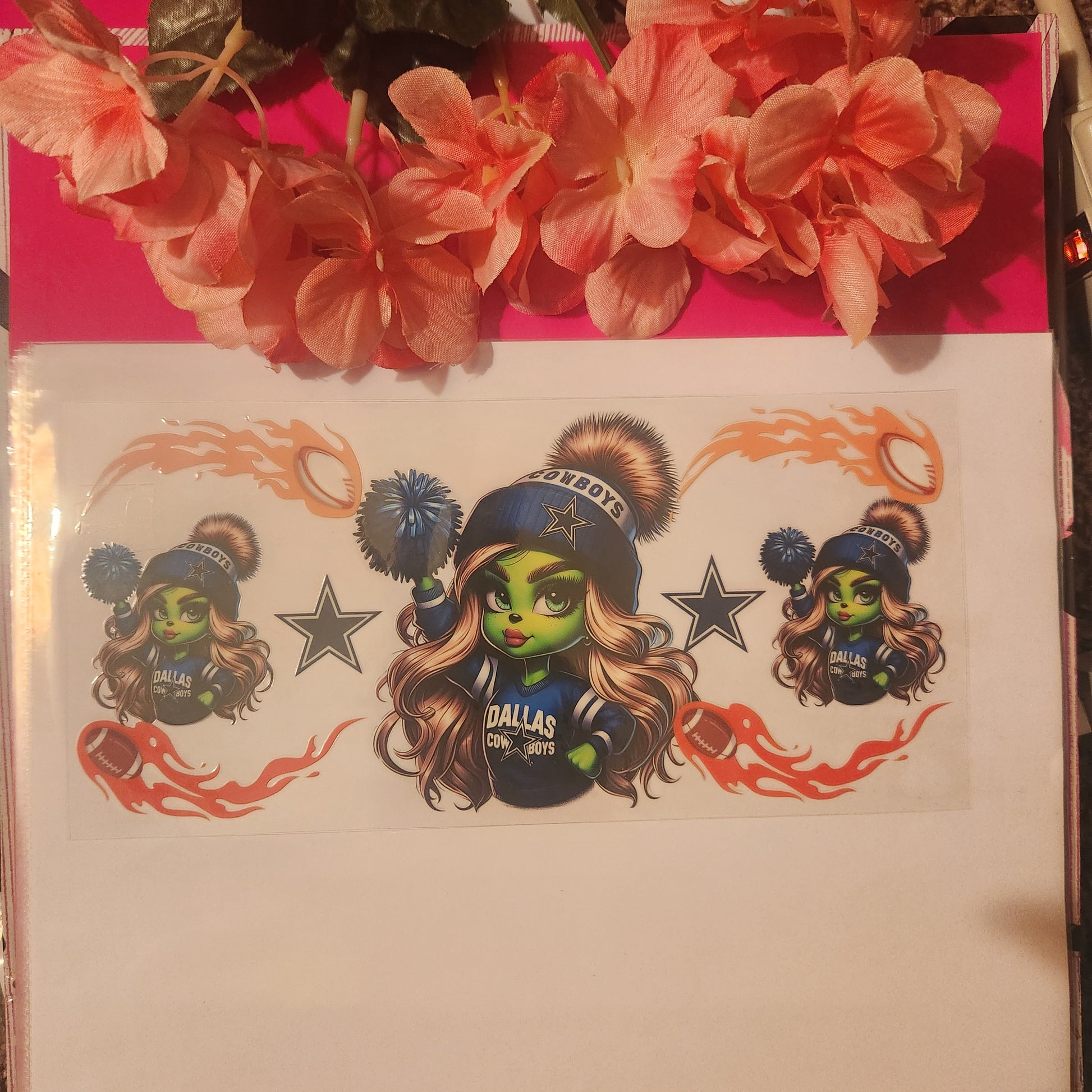 Elevate your Dallas Cowboys pride with our exclusive Dallas Cowboys Grinch decal. Made for girls, this decal features the iconic Grinch in a Cowboys jersey, showcasing your love for the team. Perfect for laptops, water bottles, and more. Show off your fandom with this unique decal!