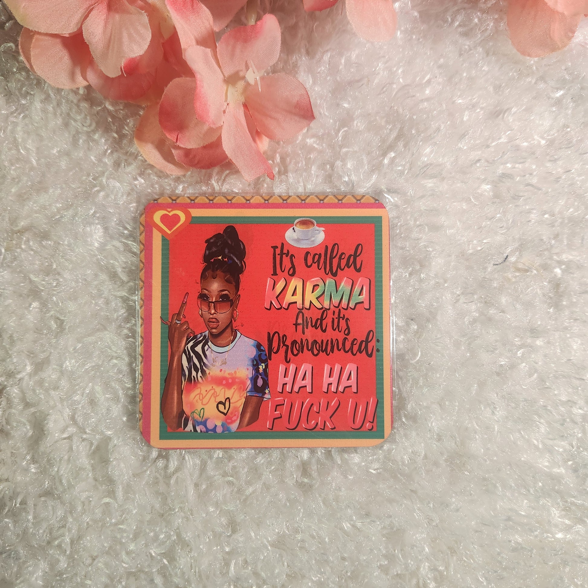 Introducing "Its Called Karma and Pronounced Ha Ha Fuck U!" coasters! These coasters add a touch of humor to any gathering and are perfect for protecting surfaces from spills and stains. Made with durable materials and a trendy design, these coasters are a must-have for any home. Add a fun and playful twist to your next gathering with Its Called Karma coasters!