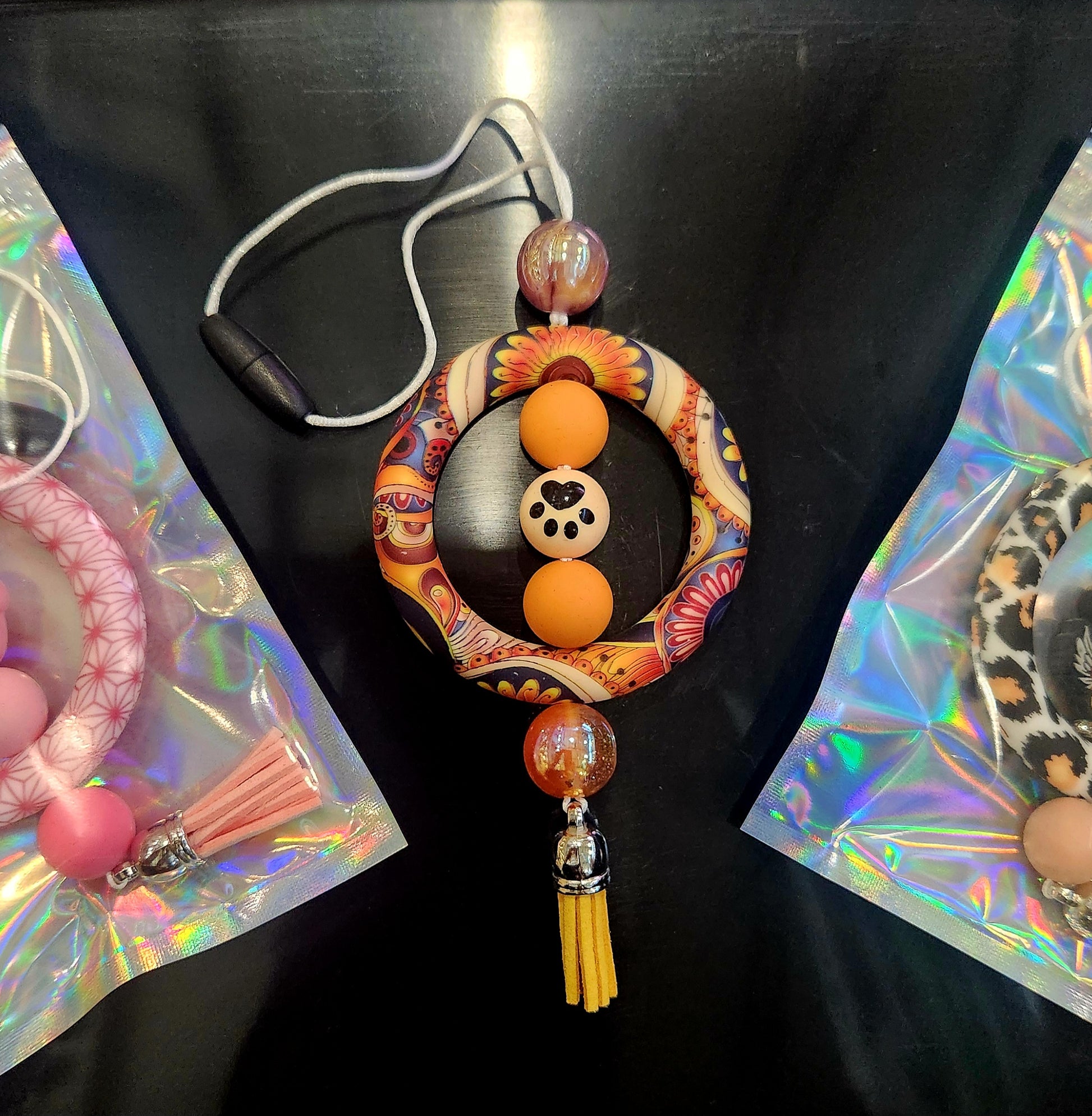 Add some paw-sitive vibes to your car with Paws, the round orange car charm featuring silicone beads in a cute dog paw design and a playful tassel. Made with durable materials, this charm will bring a touch of fun and protection to your daily drives.