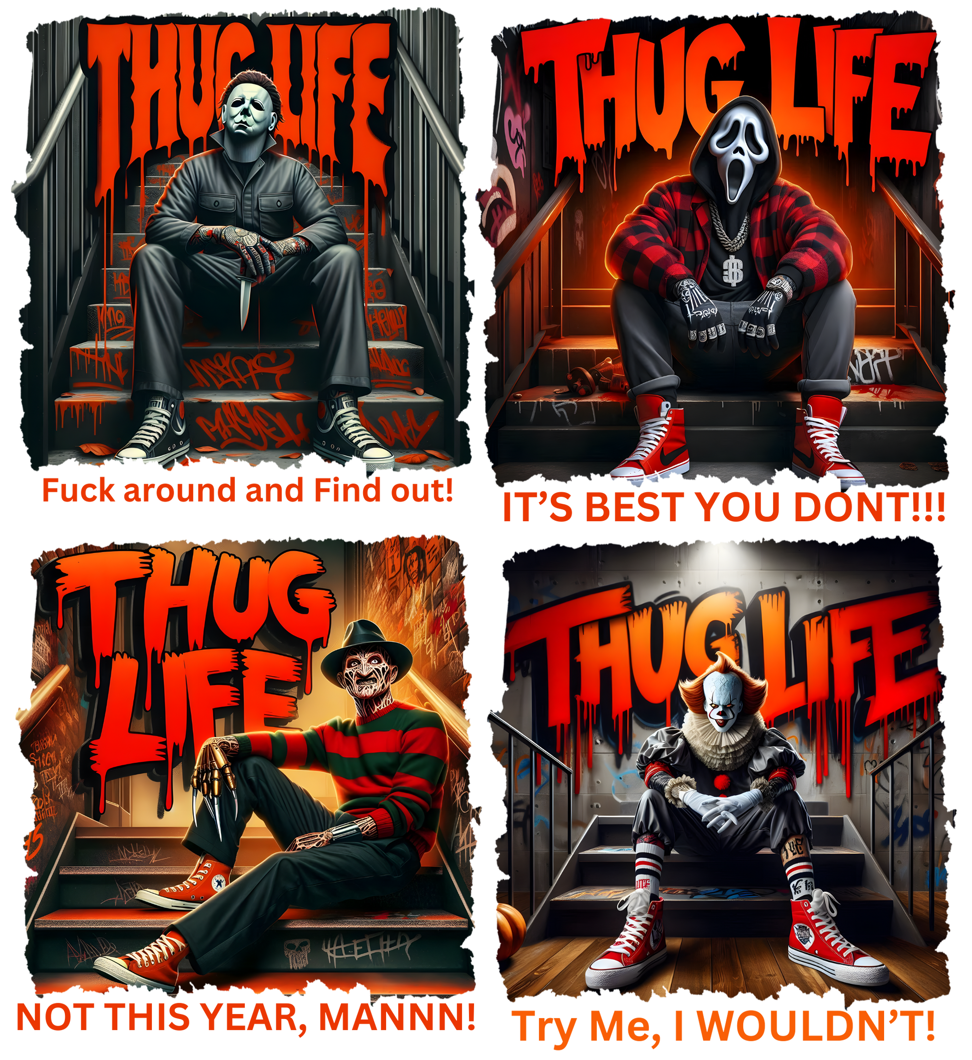 Take your cup game to the next level with our Thug Life #5 tumbler wrap featuring iconic characters Michel, Freddie, Scream, and Penny Wise. Keep your drink cold and your style on point with this tough and trendy accessory.